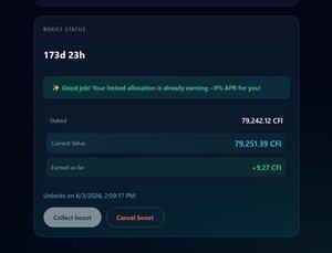 Aktuální APR je 9 % a hodnotu svého xCFI můžete vidět na portálu, kde jste stakovali $CFI.