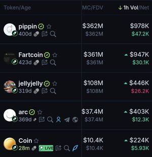 Топові монети Pumpfun за останню 1 годину за обсягом: $Pippin $Fartcoin $Jellyjelly $Arc $Coin